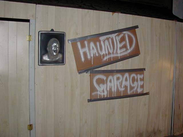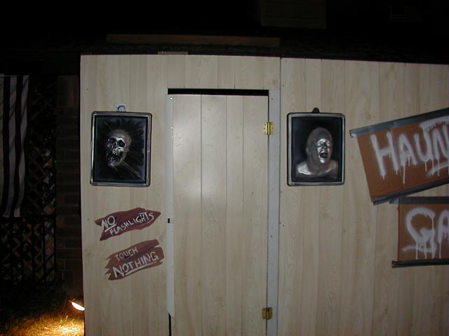 Entrance One of the most elaborate things we did for our 2001 haunt was construct an additional hallway outside of and leading into the garage. This was done for a number of reasons. Primarily, my garage didn't have as much space as Victor's did last year, so we felt we needed the extra space. Also, we wanted our guests to enter through a door to give the effect of entering a haunted house. The false front enhanced this effect even further by disguising the garage door.